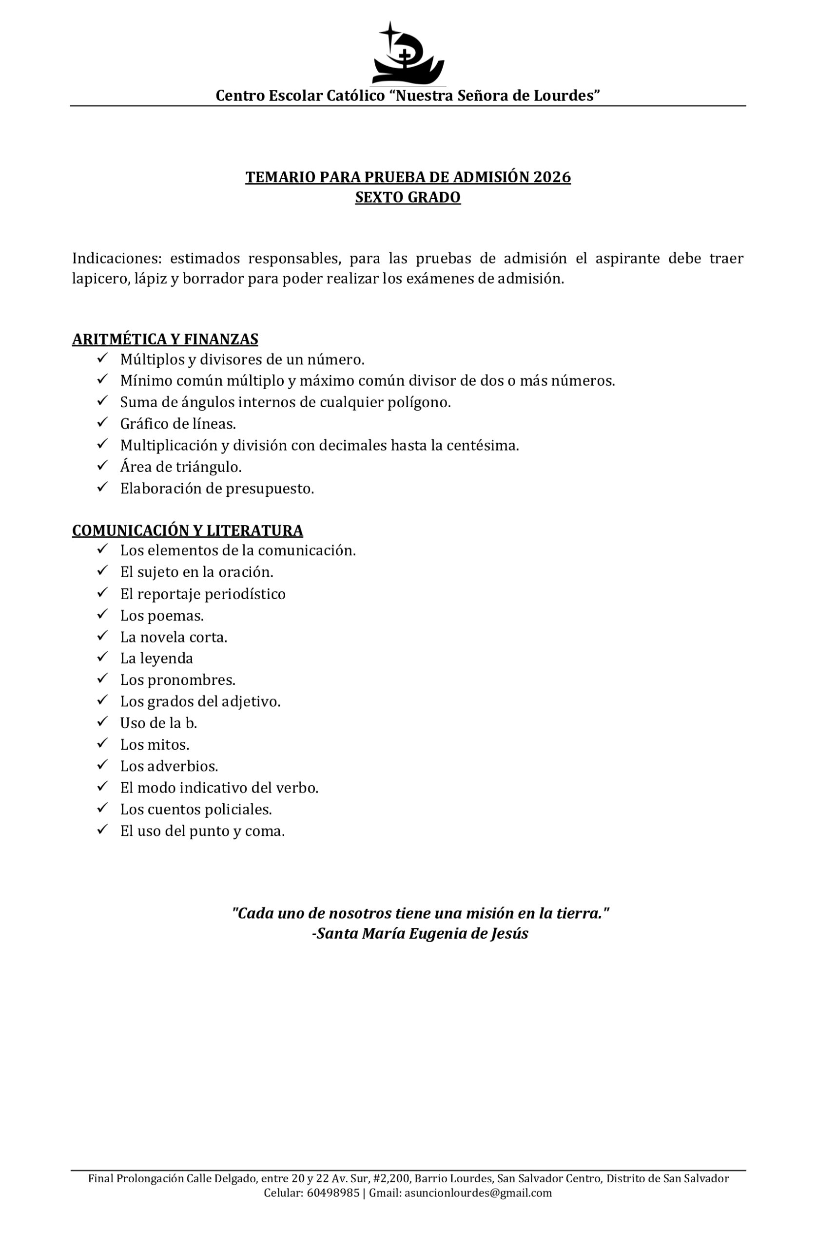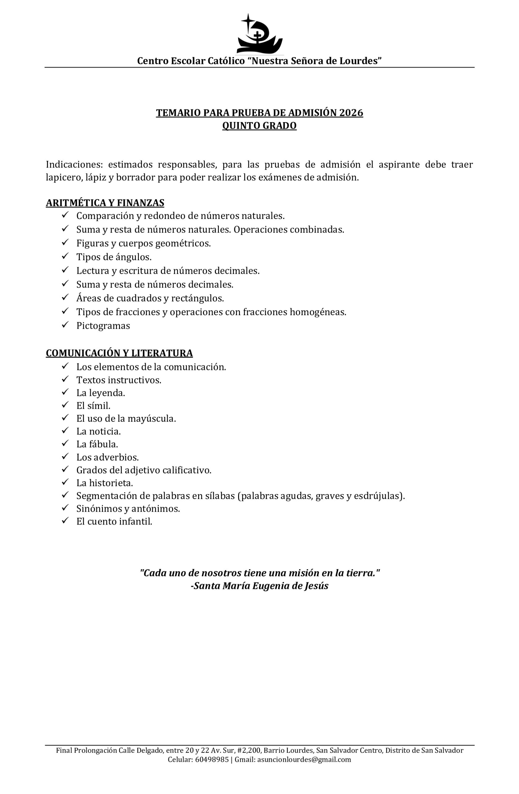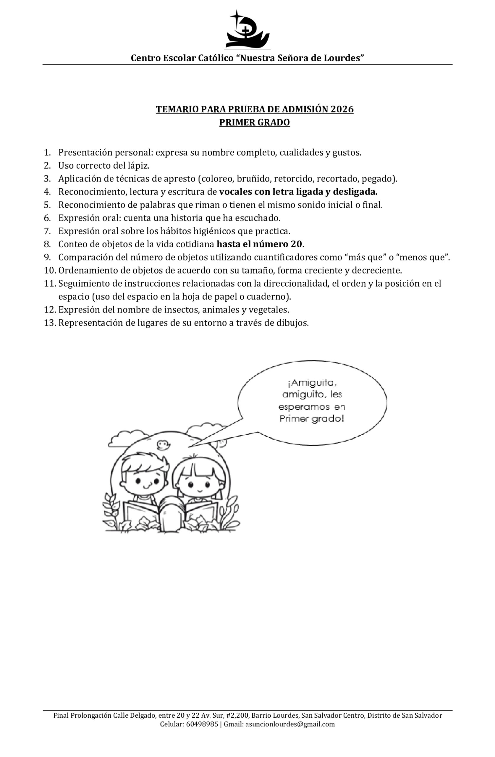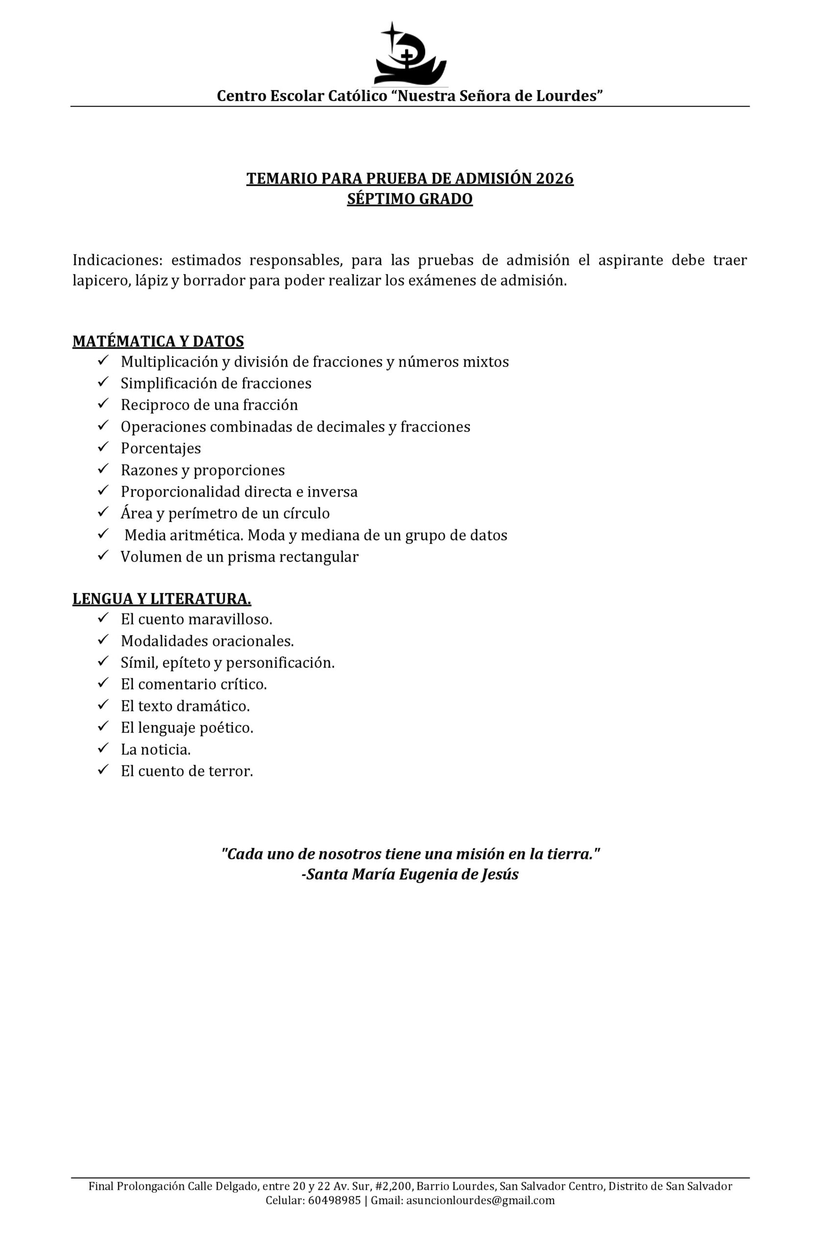 Estimadas familias, a continuación compartimos los temarios de estudios para los exámenes de admisión para el proceso de Nuevo Ingreso 2026.